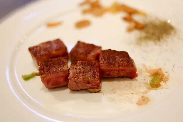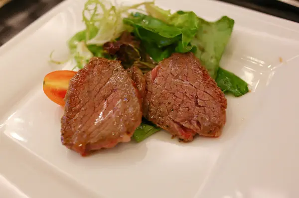 廚師會先詢問牛肉喜好的熟度,如果依廚師建議就是紅不見血的五分熟,油脂分布相當豐富,接近入口即化的程度,沾點海鹽更加鮮甜美味。