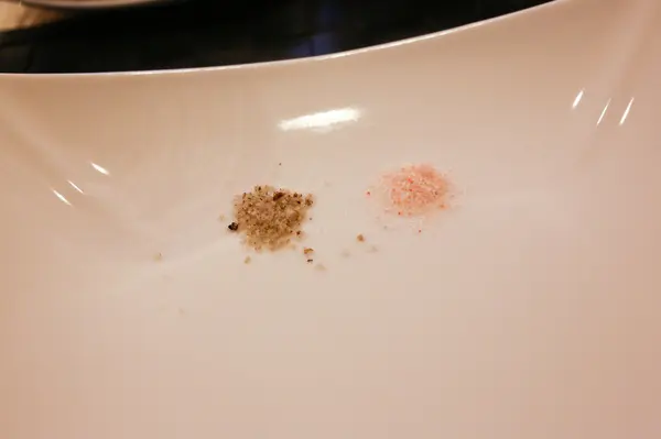 吃牛排除了必備的蒜片外,此時廚師給了兩種海鹽(名稱已忘XD)。