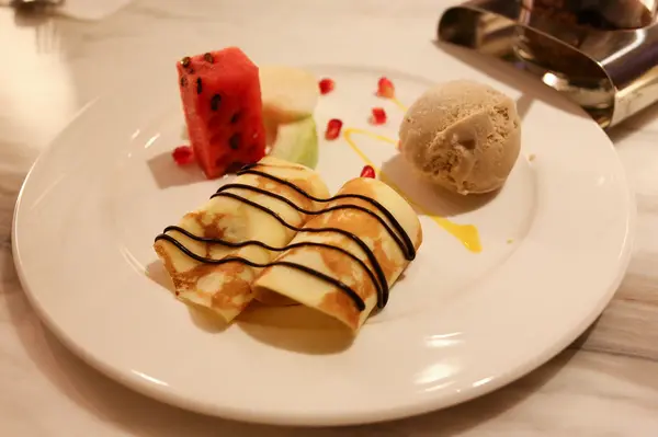 甜點共有兩種可以選擇,都有新鮮水果和冰淇淋,都用紅色的番石榴點綴餐盤,法式香蕉薄餅搭配的冰淇淋是伯爵茶口味,與想像中酥酥的香蕉煎餅不一樣,是用蛋皮包著完整