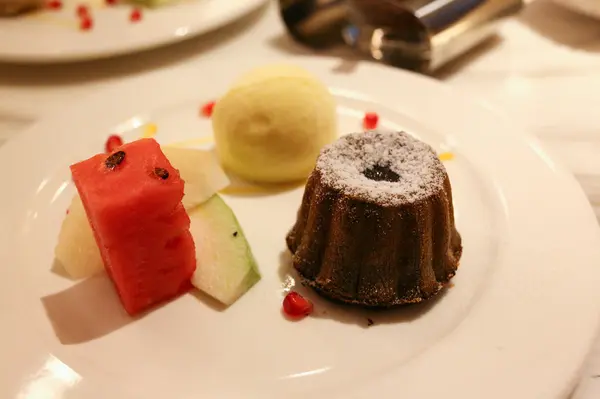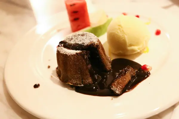 這款甜點令人驚艷,搭配的冰淇淋是香草口味,恰巧跟王品牛排與雅室牛排不謀而合,巧克力蛋糕裡滿滿都是液態溫熱的巧克力醬,蛋糕體很紮實類似布朗尼的口感,巧克力醬