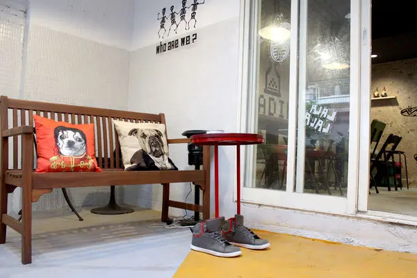 戶外座區椅上有著酷玩的麥克傑克森紅色抱枕,