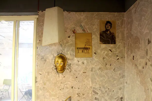 牆壁上貼滿拼拼剪剪的英文報紙電影海報,
