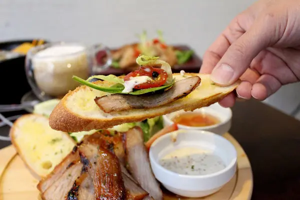 大蒜麵包上放點生菜,松阪豬肉,在佐點沙拉醬,