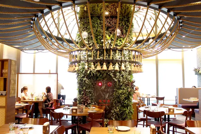 一進店內看見麻繩由中間植栽圓柱散落垂開,