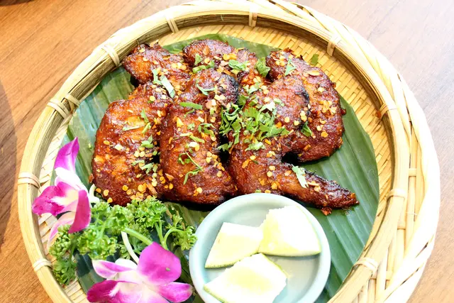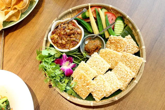 特色的東南亞風情竹籃編織盤盛裝,讓這道料理別具風味。
