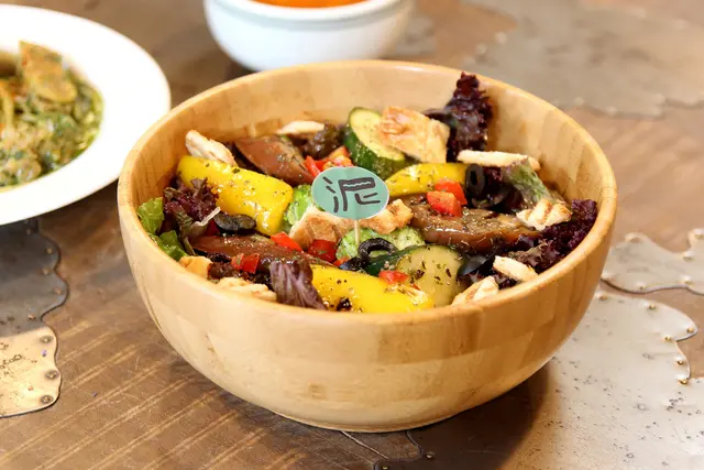 草泥Cafe沙拉木盆裡有木櫛瓜、茄子、甜椒、美生菜、橄欖、聖女蕃茄和煎烤吐司丁,