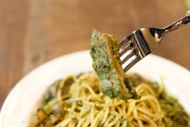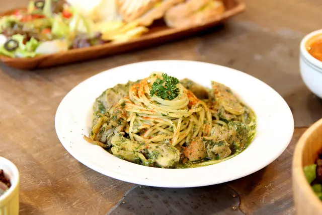 草泥Cafe自製的青醬相當濃郁,有著鮮甜滋味,雞腿肉質軟嫩,份量給得蠻大方的,