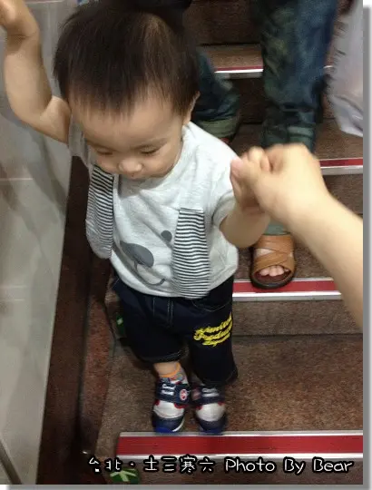 小心翼翼踩著步伐下樓梯的丫尊ㄟ,還受到路人的鼓勵呢