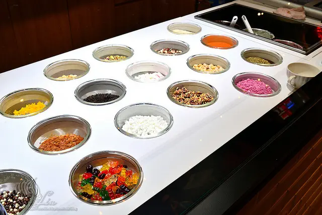 特製雪糕的佐料們,選擇使用的雪糕口味後,再選3種佐料料,最後淋醬就完成自己的雪糕了!