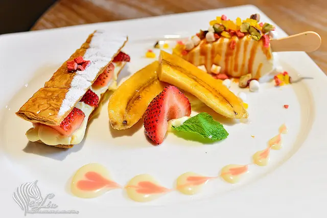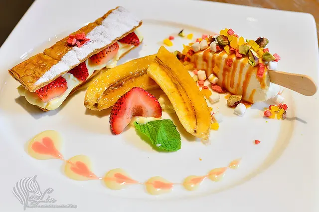 莓感安菲洛是少女最愛的草莓法式千層派,配上滿是果粒、堅果、及焦糖的風味雪糕,中間還有裹糖的香蕉~