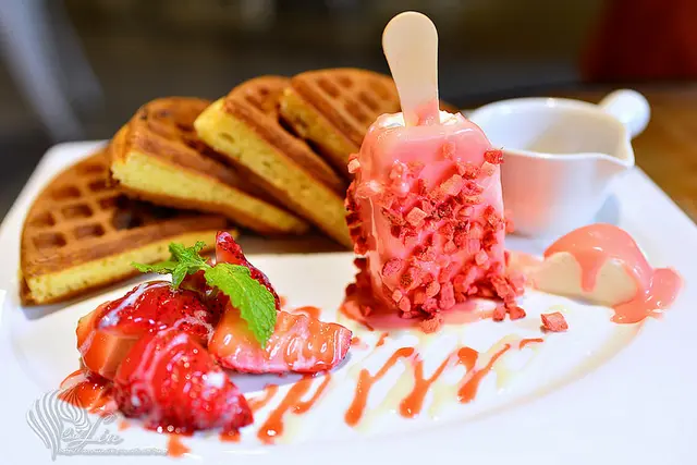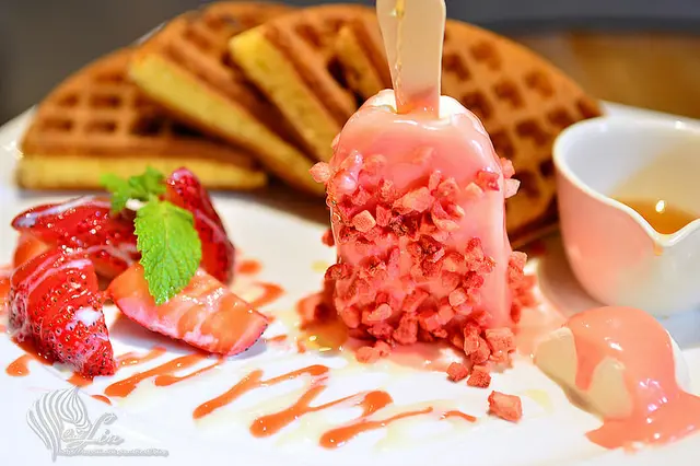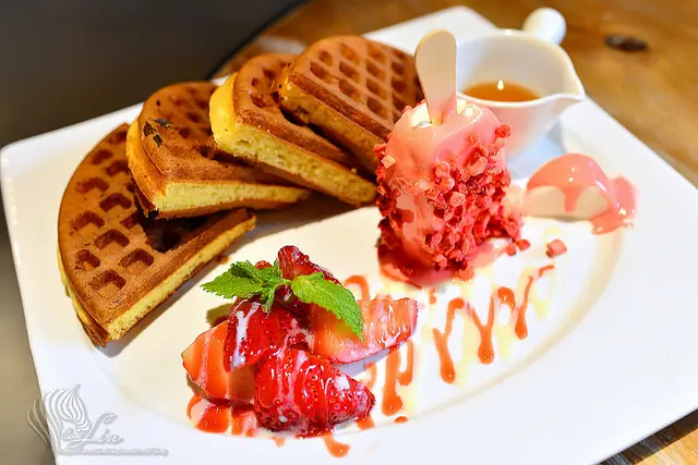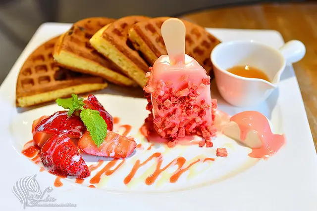 這盤非常豐盛,除了熱呼呼的現做鬆餅,還有滿是草莓醬及草莓乾顆粒的風味雪糕,以及新鮮草莓、煉乳、蜂蜜,每一口鬆餅都能用各種配料變出不同口味。