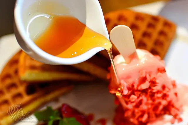 雪糕的醬比較甜一些,而草莓乾則是偏酸,搭在一起的酸甜滋味很不錯,另外也可以再淋上一些蜂蜜,雖然甜度會飆高,蜂蜜香卻也超搭。