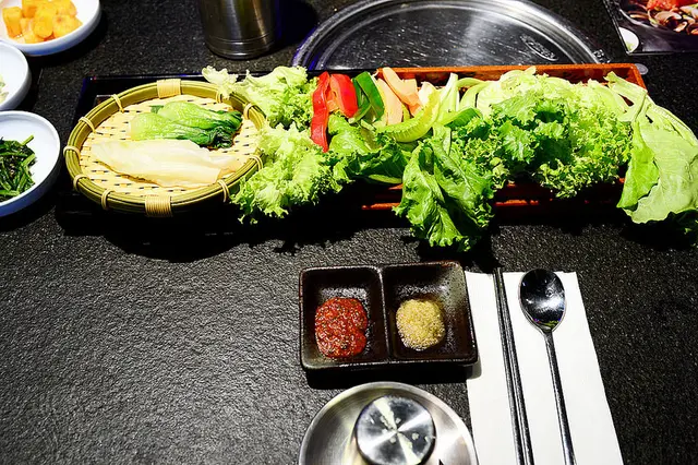 店內提供用來搭配烤肉的生菜,種類分別有幼嫩福山萵苣、大將萵苣源、綠捲萵苣、義大利綠精靈、紅捲萵苣、蘿美心、紅蘿蔔、青江菜、青椒及紅椒,讓消費者在搭配實可以有非常多的變化性,就連擺著看也賞心悅目。