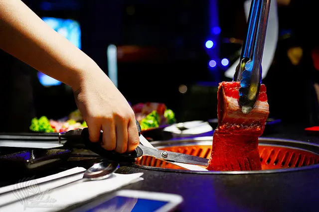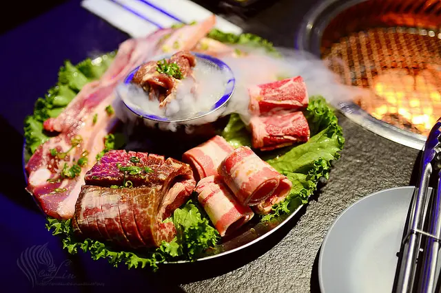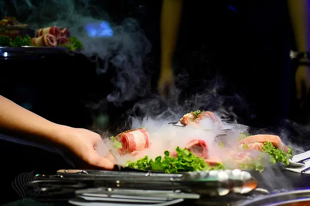 ▽ 從乾冰飄的方向可以發現火爐內建強力抽風,燒烤過程中幾乎聞不到烤肉香,店家保證噴了香水來用餐,離開時身上依舊只有香水味。