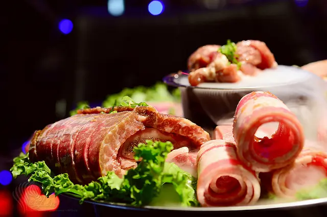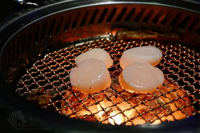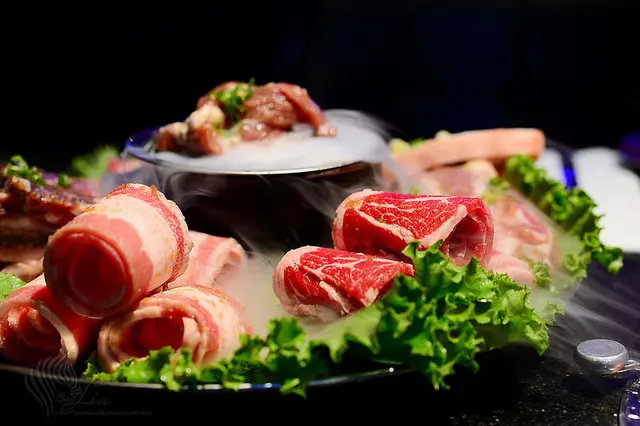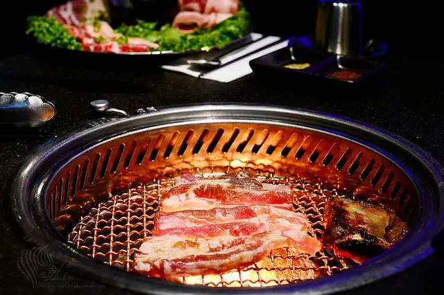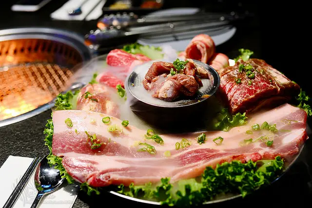 如上圖所示,這盤肉的份量真的相當大,而且肉的部位、品質都很優,有帶骨牛小排、霜降牛肉、牛五花、豬五花、護心肉、豬肋排,品質都相當的好,厚切肉品還都會有工作人員桌邊服務代烤呢!