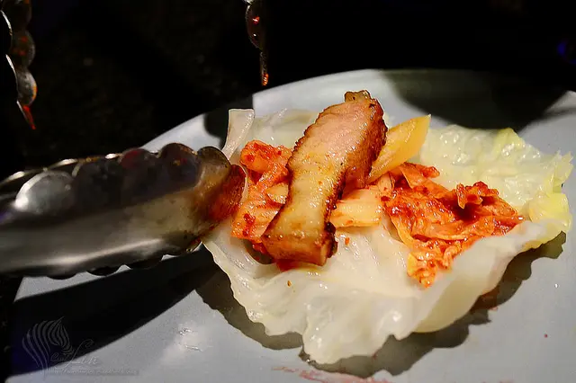 店家的豬五花燒烤手法讓大部分的油脂都被火逼了出來,原本看著肉覺得很擔心油膩感,沒想到吃起來完全不覺得油呢! 配著燙熟後急速冷凍過的超甜高麗菜、辛甜泡菜及洋蔥食用,確實和店家介紹的一樣,清爽的口味完全讓人吃不出這是五花肉~