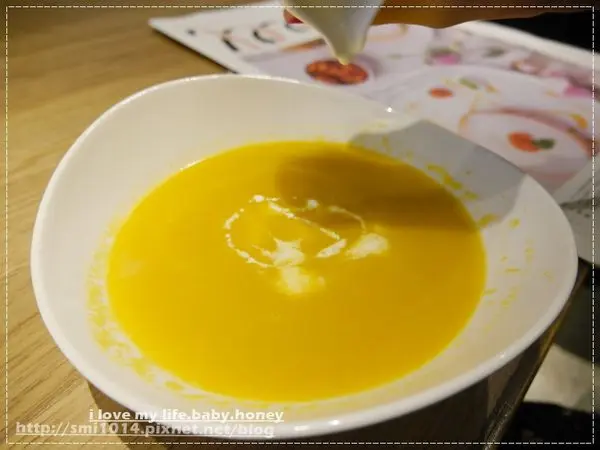 再淋上法國lSIGNY奶油,淡淡的乳香把南瓜湯襯托得更濃郁