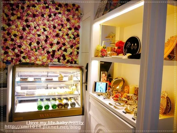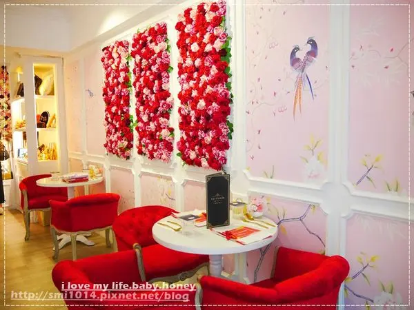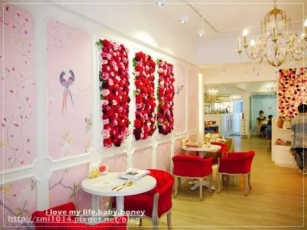 店內大概分成三種色系的裝潢,前面是一整排浪漫玫瑰花牆