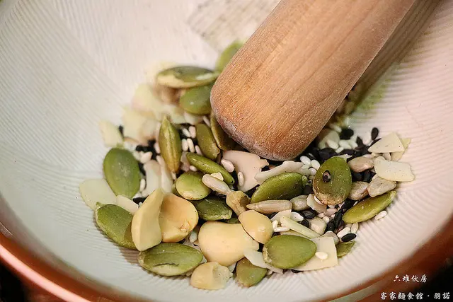 在碗裡加入各式的堅果 然後讓我們DIY 將它們磨成粉狀
