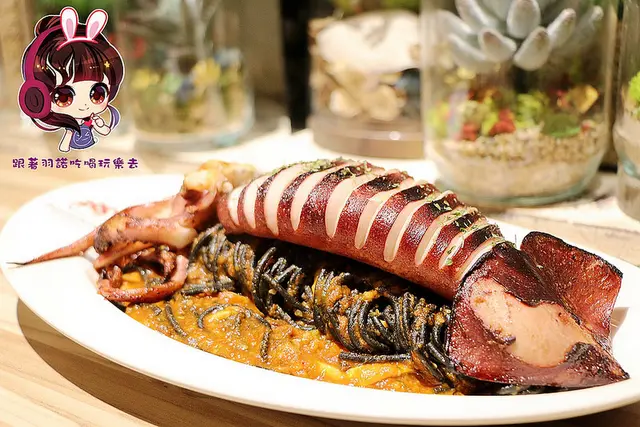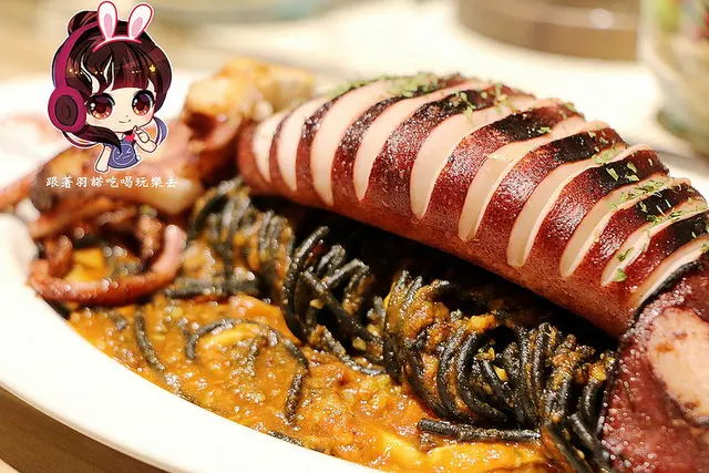 這個茄汁墨魚麵附煎烤魷魚排是蘑菇森林的必點招牌