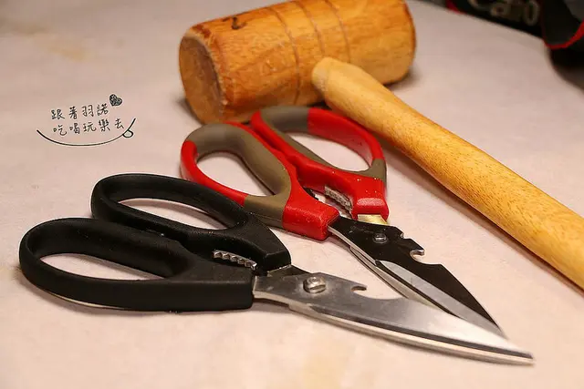 餐點上桌前店家會先給我們剪刀及槌子喔