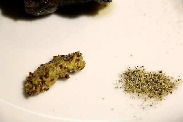 還可佐著一旁的蒜片 玫瑰鹽 胡椒粒 芥末籽(由左至右)一起享用