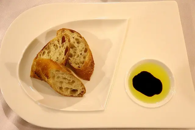 口感扎實的法國麵包沾上了迷人香氣的巴薩米克醋及白松露結合的油醋醬
