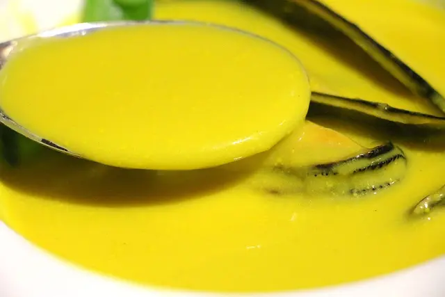 以白酒將南瓜炒香 湯底使用雞胸肉及蔬菜熬煮4小時