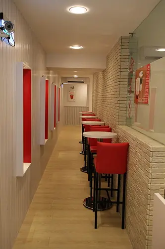 木製的地板搭配紅色的高腳椅 內用區非常寬徜