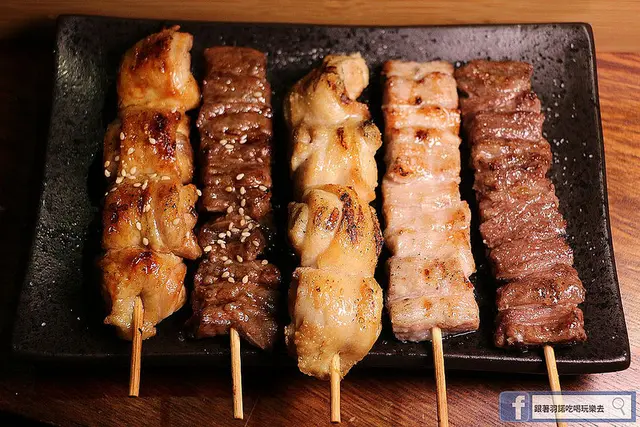 雞腿串(醬燒)、安格斯牛肋串(醬燒)、雞腿串(鹽燒)、松阪豬串(鹽燒)、安格斯牛肋串(鹽燒)