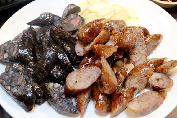 右邊的是一般的香腸,但有些許的酒味,肉質頗為札實。