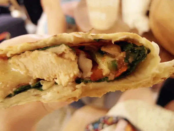 搭配裡面的菠菜葉、紅椒跟雞肉一起入口