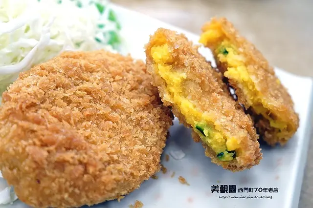 表面麵衣相當酥脆,是吃可樂餅的第一要件,再來中間的內餡口味也很重要,