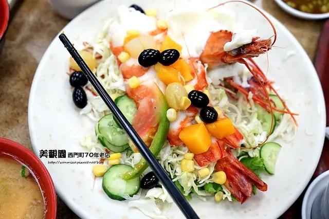 超愛海鮮的汪喵,忍不住點了這大明蝦沙拉,底下舖了滿滿的高麗菜絲,