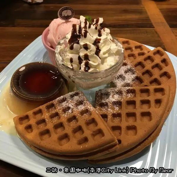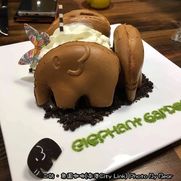 有著可愛小象外型的鬆餅搭配豐富的布丁/鮮奶油/巧克力碎屑等配料
