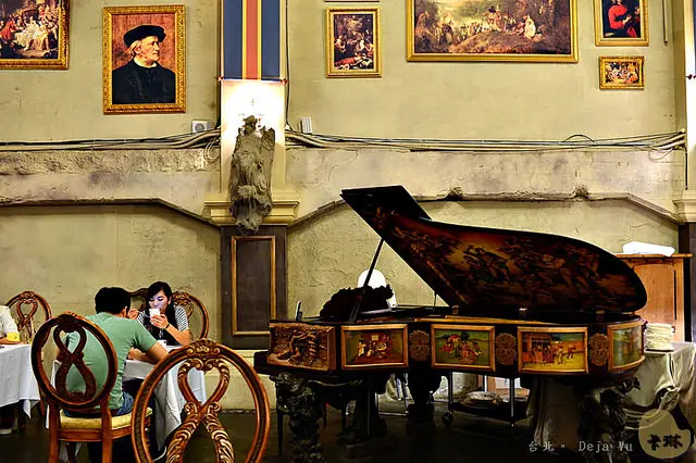 蝙蝠車的正對面則是這台華麗的古董三角鋼琴,鋼琴的雕刻及繪畫讓我覺得很有趣,用餐過程中不時盯著鋼琴看。