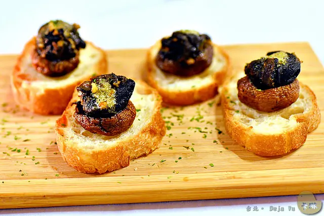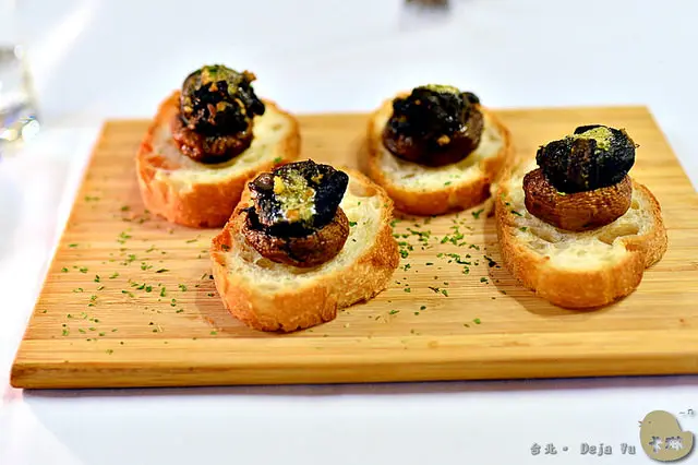 開胃菜的「法式香蒜焗烤田螺鑲蘑菇」,選用新鮮蘑菇作為螺肉底座,並以焗烤的方式料理使磨菇和田螺能夠保有Q彈口感。