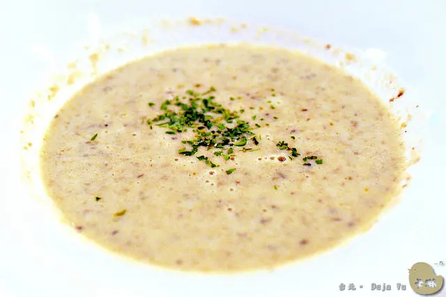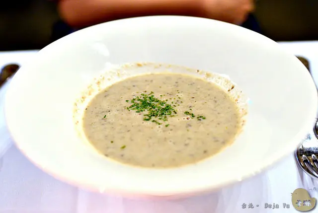 「法式蘑菇奶油濃湯」以橄欖油,爆香洋蔥碎、義大利綜合香料,再加入白蘑菇片、香菇片拌炒,超濃稠的湯裡全是磨菇的口感及氣味。