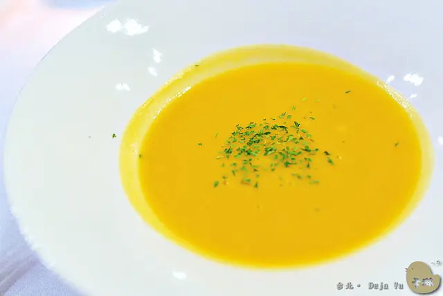 「帕瑪火腿南瓜濃湯」中沒看見火腿,不過這沒什麼關係,因為湯喝起來很南瓜,自然甜度反覺清爽。