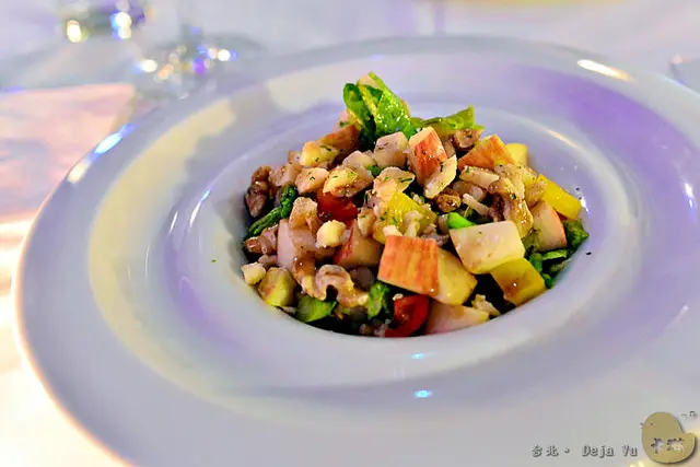 醬料則以口感清爽的茴香搭配煙燻鮭魚及鵝肝醬,香氣濃厚討喜,可惜除了磨菇及田螺以外的麵包區域則顯得太過單調無味了。