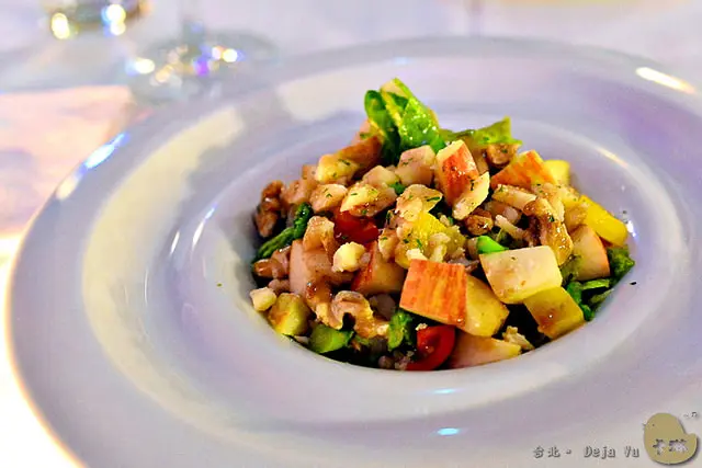 「核桃蘋果芝士沙拉」融合了蘋果丁以及切碎的核桃和番茄、甜椒,並以美奶滋為基底,再配上起司粉。