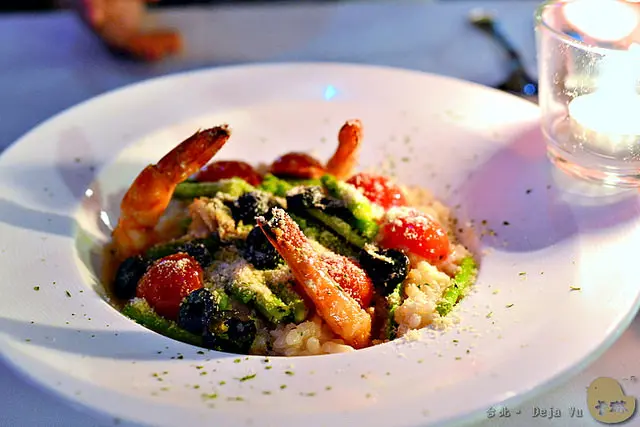 「義式明蝦燉飯」使用的是義大利米,因地制宜的配合台灣人慣吃的口感,煮得比義大利道地口感軟些,已經剝好殼的蝦子吃起來非常輕鬆。