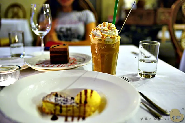 飲料點的是「焦糖瑪奇朵冰沙」及「奧地利王子白葡萄酒」,「奧地利王子白葡萄酒」 是來自皇家奧地利皇室御用酒莊Esterházy皇家酒莊較為年輕的Royal Collection皇家系列,口感較為清爽,充滿水果芳香,非常適合做餐前酒,所以點這個的話不妨請服務人員隨前餐送上。「焦糖瑪奇朵冰沙」奶油超級 多,雖然奶油上滿是焦糖,下頭的冰沙其實不會很甜呢!