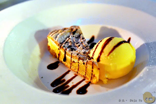 「蘋果派與冰淇淋」的照片顏色變得好怪,其實沒這麼鮮豔黃的,派本身偏酥硬,口味不算太甜。