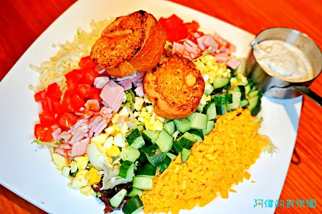 顏色繽紛如彩虹般的沙拉,有番茄、火腿肉、水煮蛋、小黃瓜、起司等食材,吃之前攪拌一下,再淋一些起司醬汁,既豐富又清爽而且無比好吃。