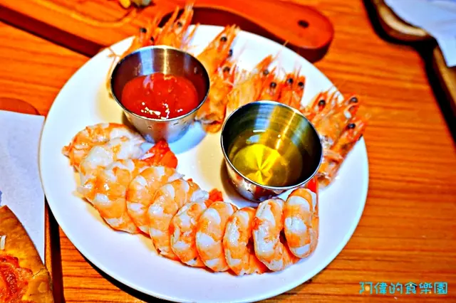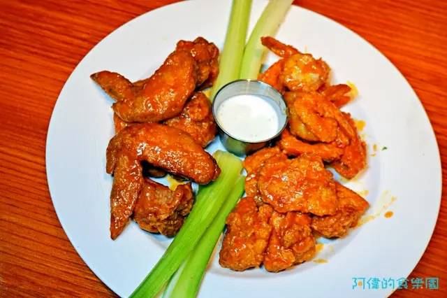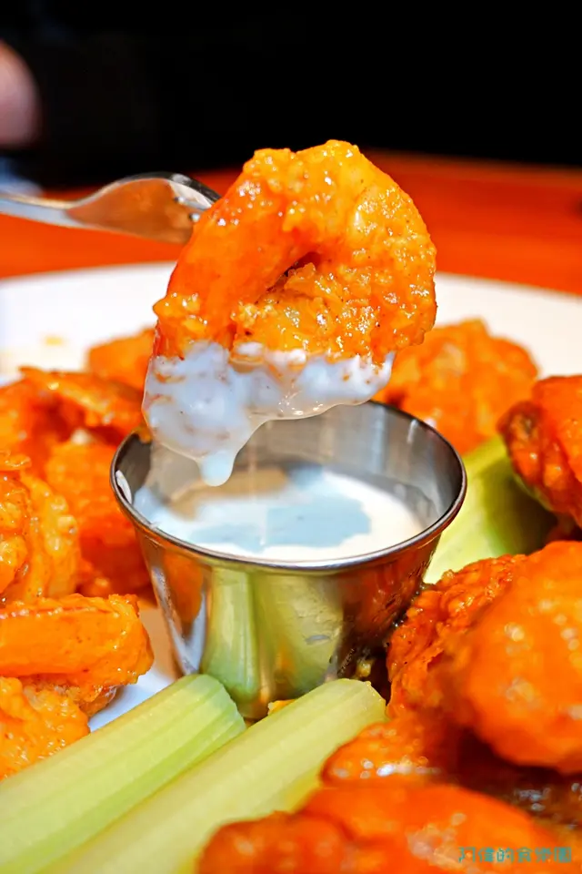 這道拼盤一邊是炸雞翅、一邊是炸蝦,上面都已包覆著獨特的水牛城辣醬,其實並不辣耶,酸酸甜甜的好開胃。