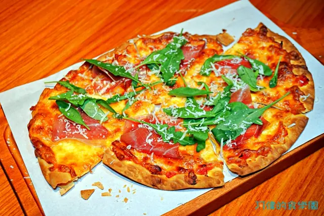 這個僅在薄薄的餅皮上用起司、帕瑪火腿、芝麻葉外加現刨的起司屑組成的披薩,口感軟香、邊緣脆脆的,出人意料的好吃。