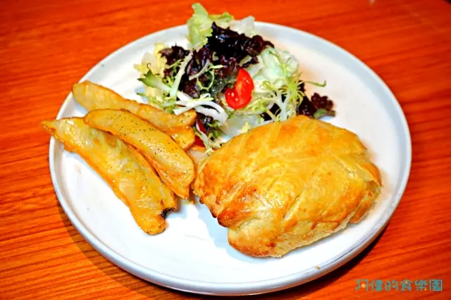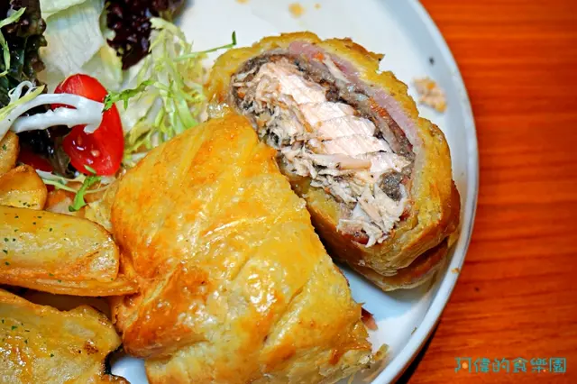 這是信義店限定的菜色,厚切鮭魚排先以舒肥增加其鮮嫩度,外層以英式辣味芥末醬、蘑菇泥與堅果泥浸潤後,再以酥皮包裹香ˇ烤而成。