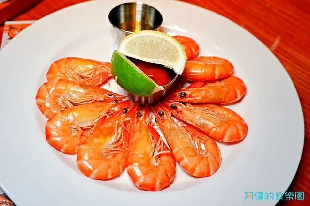 新鮮漂亮的十隻白蝦燙熟後放在盤上,還附有兩種醬料與檸檬片提味。