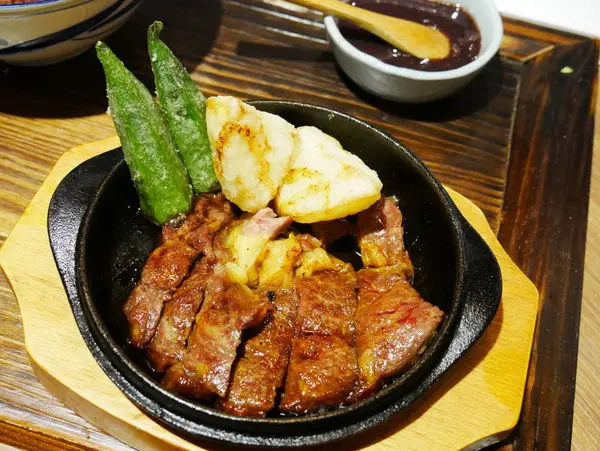 鐵盤上的牛排淋上照燒醬汁,多了甜甜的味道